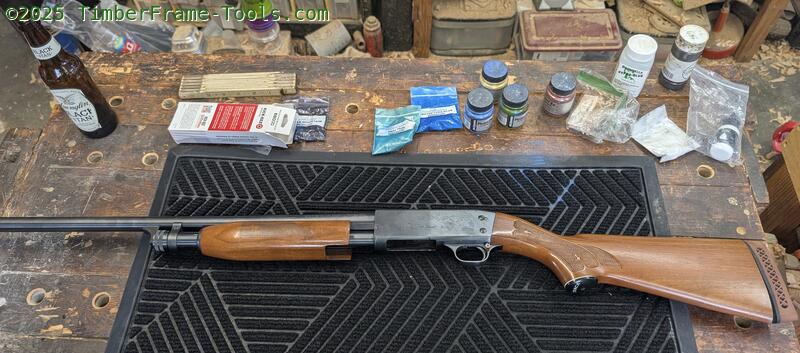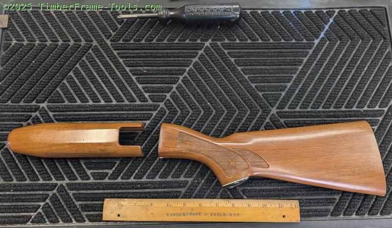 The original wood on finish on the stock had the pump handle and the butt stock identical in color.  Both were kind of a lighter tan than traditional walnut.  However, when I hit the bare wood with the Tung oil, they both achieved more traditional Walnut colors but the pump handle was several shades lighter.  This tells me two things.  1. The factory finish used a color toner in the finish to make both pieces of wood match. 2 The toner was lighter than the natural wood’s color.  I thought they might come closer the same color when I put more coats of Tung Oil on.  Nope, they were still different in color. The pump handle was several shades lighter.  It was important to me that they match.  So I took the pump handle off and sanded away most of the Tung oil finish.  Once I had it down to bare wood, I hit it with a few swipes of TransTint Dark Walnut dye I mix the dye in alcohol and wipe it on with a cloth. Now when I put the Tung Oil on it, the colors are much closer.  The butt stock has some more open grain that the pump handle which gives it some nice mineral streaks that the pump lacks.  Not much I can do about that.