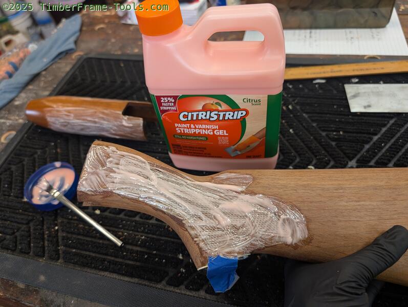 Unfortunately, you can’t use the scraper near the checkering so will have to resort to using CitriStrip stripping gel .  I paint a small amount on with an acid brush and let it sit about an hour.  Then I wash it off with water and a soft tooth brush.  The water will not hurt the stock, just let it air dry naturally.