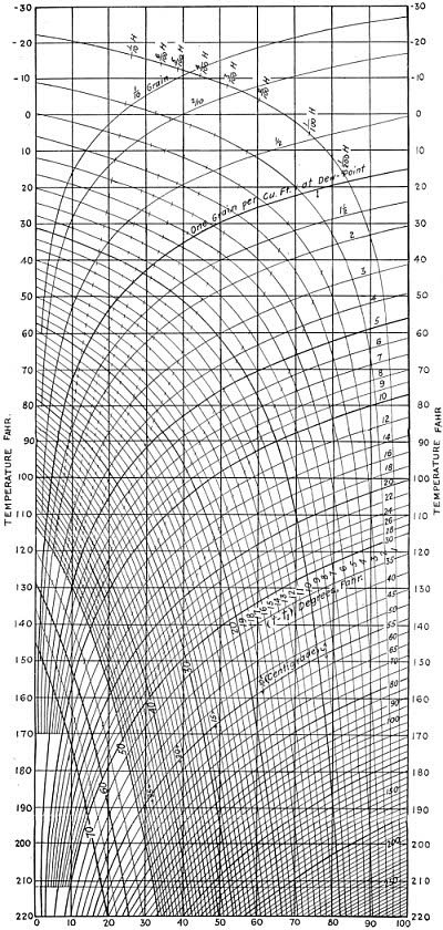 Example: Dry bulb 70°, wet bulb 62°. On the vertical line for 70° find the intersection with the hygrometer (convex) curve for 8°. This will be found at nearly 64 per cent relative humidity. Then follow up parallel with the vapor pressure (concave) curve marked 5 grains to its intersection at the top of the chart with the 100 per cent humidity line. This gives the dew-point as 57°.