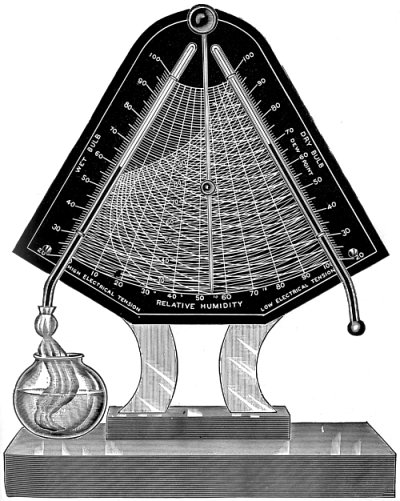 To find the relative humidity in the atmosphere, swing the index hand to the left of the chart, and adjust the sliding pointer to that degree of the wet-bulb thermometer scale at which the mercury stands. Then swing the index hand to the right until the sliding pointer intersects the curved line, which extends downwards to the left from the degree of the dry-bulb thermometer scale, indicated by the top of the mercury column in the dry-bulb tube.
