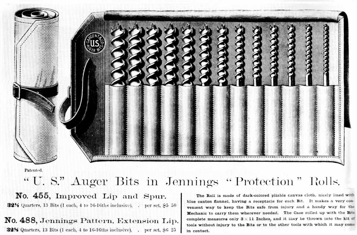Figure 55. Figure 55.—1855: Russell Jennings’ improved auger bits, first patented in 1855, received superior citation at the Philadelphia Centennial; in the years following, the trade name “Jennings” was seldom omitted from trade catalogues. (Original wash drawing, patent drawing submitted by R. Jennings, U.S. Patent Office, Record Group 241, the National Archives.)
