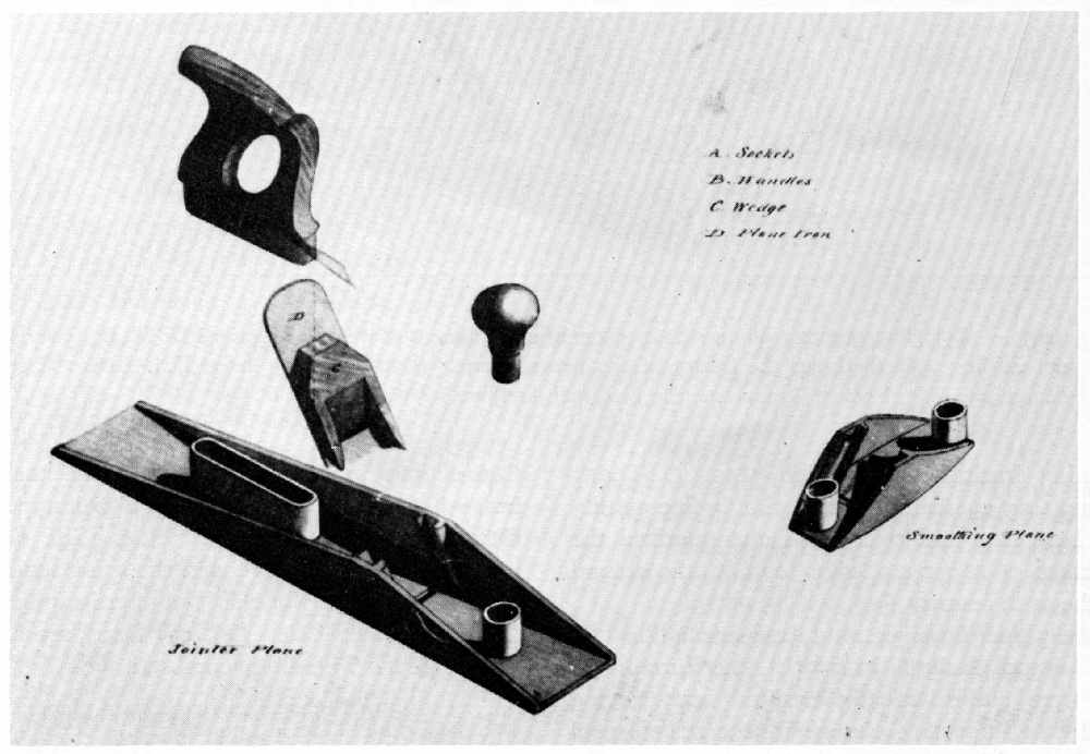 The solid wood-block plane, varying from country to country only in the structure of its handles and body decoration, had preserved its integrity of design since the Middle Ages. At the Centennial, however, only a few examples of the old-type plane were exhibited. A new shape dominated the cases. Designated by foreign observers as the American plane, it received extended comment. Here was a tool