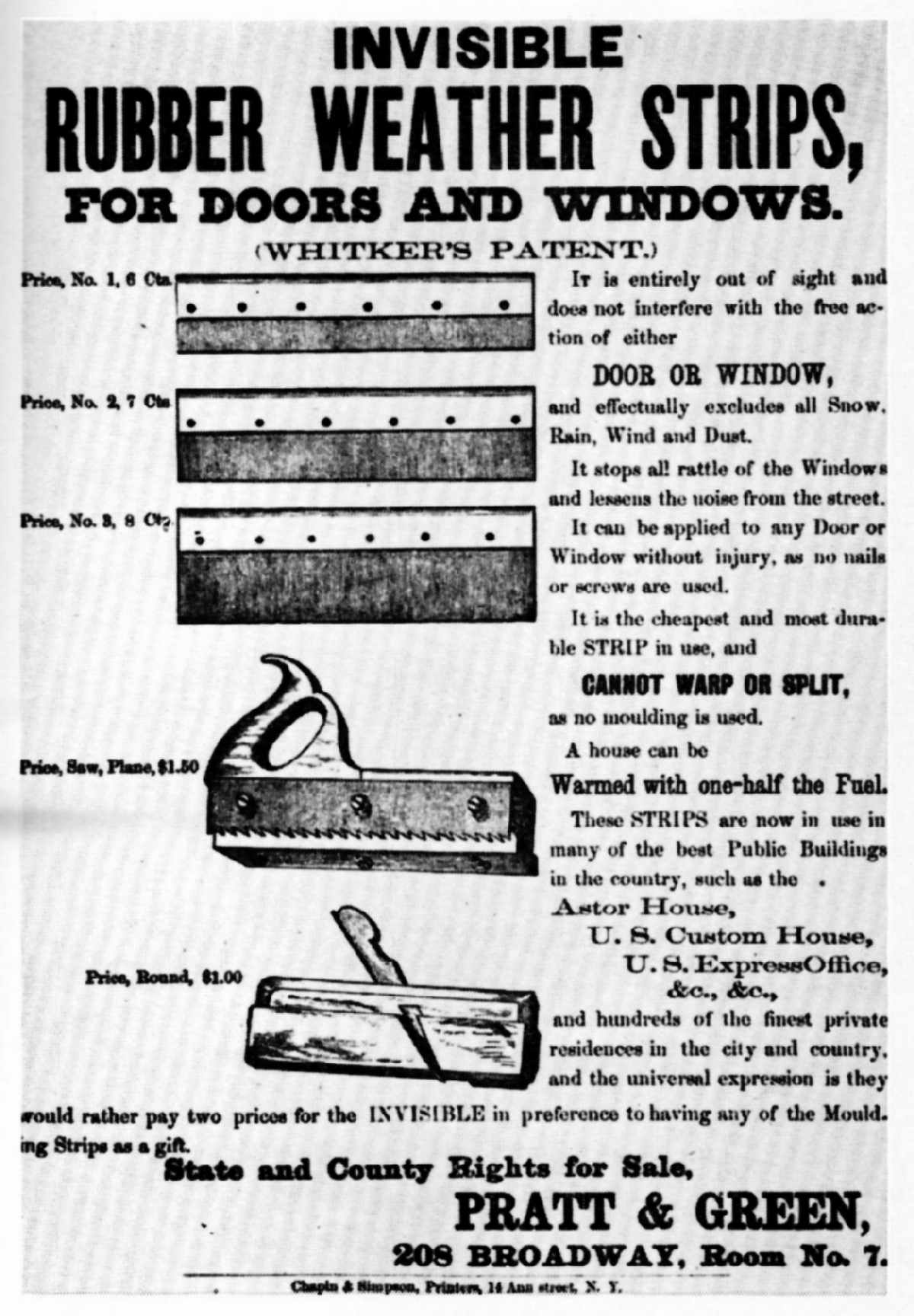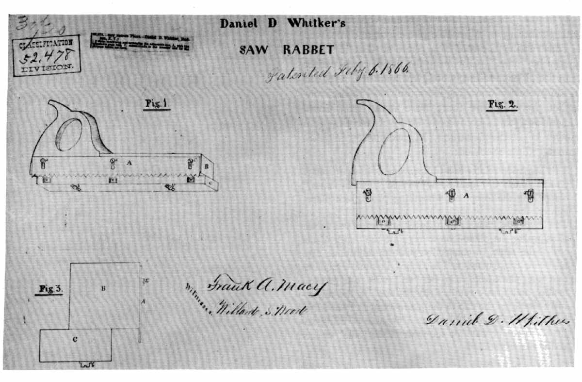 The announced object of Theodore Duval’s improved grooving plane (pat. 97,177) was “to produce in one tool all that is required to form grooves of several different widths.” None was more appealing than Daniel D. Whitker’s saw-rabbet plane (pat. 52,478) which combined “an adjustable saw with an adjustable fence or gage, both being attached to a stock with handle similar to a plane, forming together a tool combining the properties of the joiner’s plow and fillister” (fig. 61). Nor was Whitker’s idea simply a drawing-board exercise. It was produced commercially and was well advertised, as seen in the circular reproduced in figure 62.